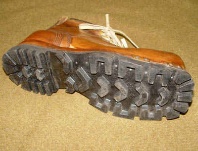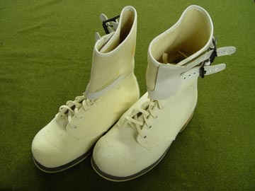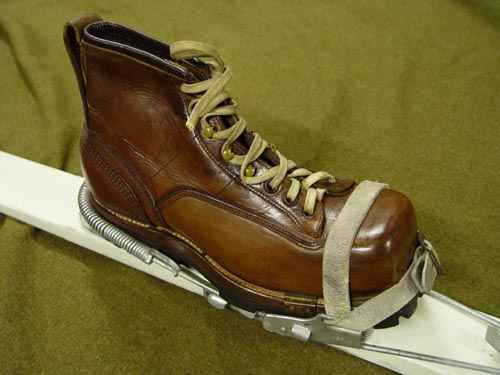Ski, ski boot and binding system used by the 10th. The skis were typically laminated hickory with segmented steel edges. The bindings were of the nonreleasable design (bear trap) and could be set up for downhill skiing with the heel secured to the ski with a cable. With a change in cable location from the rear to the side of the toe piece, the binding converted to a cross-country type binding where the heel would lift during the stride. The boots had a square toe and heel grooves to accept the securing cable. The boot was only ankle high, giving relatively little support for edging purposes; typical of the boot technology of the period.