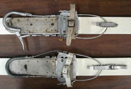 Bear trap ski binding with toe strap which was removed while not in use to tie the pair of skis together for easy handling. Shown above are two styles