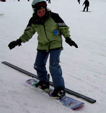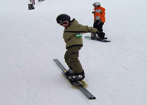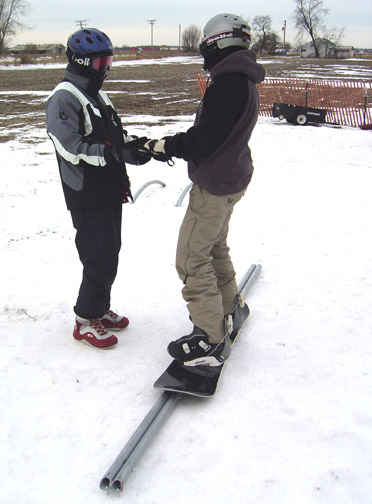 The best way for a prospective terrain park rider to start learning about movement is to ride onto a portable fun box because it’s distinctly wider than the rails. But the teaching progressions discussed in this article work equally well on both fun boxes and rails. You can facilitate mounting either feature by making sure there’s a small mound of snow at the uphill end of the box.