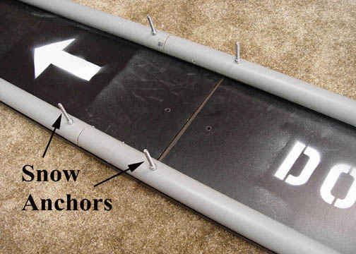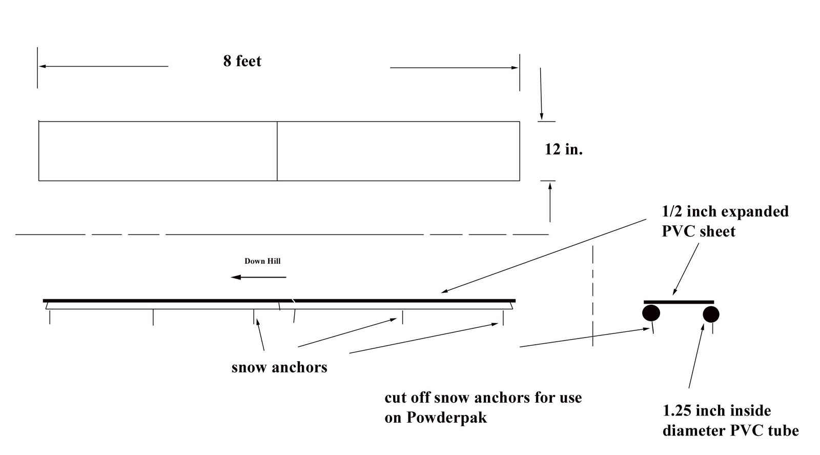 A 1.25 inch outside diameter tube is used to join the two pieces together. Snow anchors are not necessary on artificial snow surfaces such as Powderpak. Figure 2 shows an underside view of the portable feature. The snow anchors are the ¼ inch bolts.