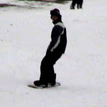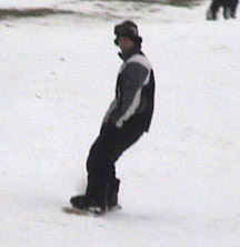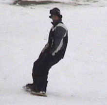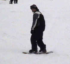 In Photo 4, the rider is crossing the fall line (the line of steepest descent) with inclination or tilting of the body in the direction of the turn. The rider controls the shape of the turn by the amount of inclination and amount of rotation of the body. Photo 5 shows the completion phase of the turn. Notice that the body rotates as a unit with the board, their relative positions being nearly the same throughout the turn. Figure 6 shows the completed turn which ended with a heel-side traverse.
