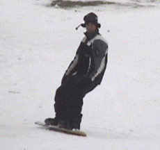 Photo 1 shows the basic toe-side traverse stance using soft boots in a freestyle position. The boots are facing nearly perpendicular to the direction of travel with a shoulder leading, in this case the left shoulder. Initiate the turn by moving the center of mass or body weight in the direction of the turn as shown in Photo 2. Continue to lean in the direction of the turn so that the old free edge of the board engages in the snow. Rotate your whole body as a unit in the direction of the turn as shown in Photo 3.