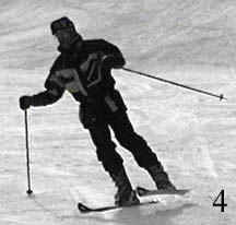 Place all the weight on the new inside ski and raise the outside ski as shown in Photo 4. Christie on the inside ski as shown in Photo 5. Return to the straight glide position (Photo 6) for the next turn.