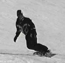 side carve with the body moving across the line of travel. Figure 10 shows the board flat on the snow, on the way to the toe side carve. Photo 11 shows the toe side carve fully engaged. Remember to make the transition from heel to toe (and vice versa) as quickly as possible because edge engagement means control. Without edge engagement, the turn is not carved, and the board will wash out, an unsettling feeling. Figures 13 through 18 show carved turns on a steeper slope with more edge angle.