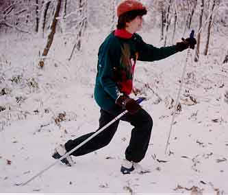 The lead leg can also be steered, resulting in the telemark turn. The positioning entails thrusting the lead leg forward in a bent fashion with the trailing leg also bent but in a kneeling position. Hands are to the side for balance and polling.