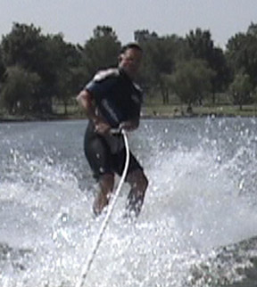 Start in the wrapped position as in Photo 1. Move the hands away from the body which allows the rope to rotate the skier starting the 360 (Photo 2 ). Continue the rotation thorough the reverse side slide position with a slight pull from the rope (Photo 3).