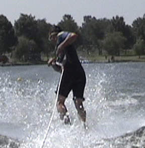Pull into the reverse wrap position (Photo 4) and hold the rope close to the body to prevent unwinding. This completes the back to back 360. The reverse is accomplished by moving the rope handle away from the center of the body allowing the skier to rotate back as shown in Photo 5. Continue the reverse rotation (Photo 6) into the original wrap position (Photo 7) to complete the reverse.