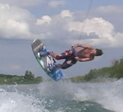 The heelside backroll is a beginning flip and should not be tried without special training and adherence to safety principles. Hit the wake and simultaneously drop the handle for slack during landing. Lean the body back as you lanch from the wave and carve away from the boat. This will start the body rotating, as shown in photo 2. Suck in the legs to increase rate of rotation. The body should be inverted at least by the high point in the jump (photos 3 and 4). Spot the landing (photo 5) and quickly extend and absorb (photo 6).
