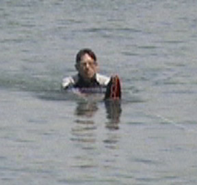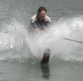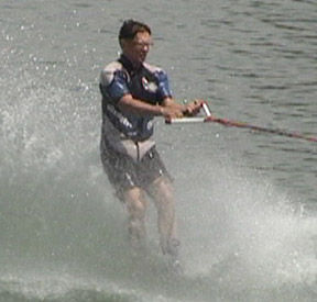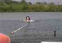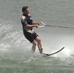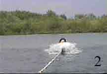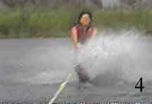 As the ski begins to plane, slowly stand up as shown in Photo 4. As speed increases, lean back to resist the tow rope pull and assume the skiing position (Photo 5).