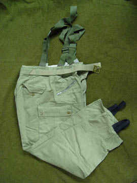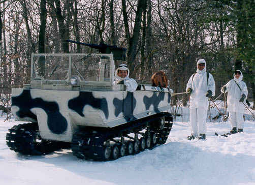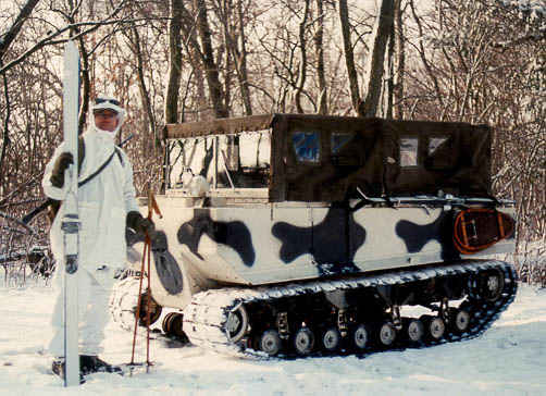 The photo above, left shows the snow camouflage shell, skis, poles and M1 "Garand" 30 cal. rifle. The vehicle is an M29C troop carrier nicknamed the "Weasel" made by Studebaker Corporation, one of the first snowmobiles. The canvas top encloses the occupant compartment which is heated. The tracks are very wide allowing the vehicle to operate on light snow.
