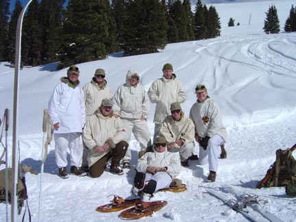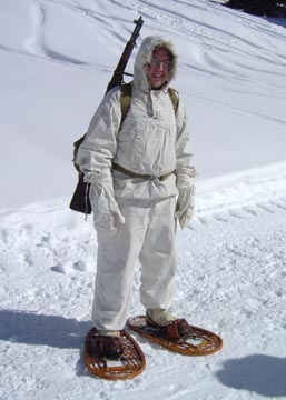 10th Mountain Soldier on snow shoes with back pack and M1 rifle