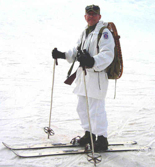 10th Mountain Soldier on skis with back pack, snowshoes and Thompson Submachine Gun