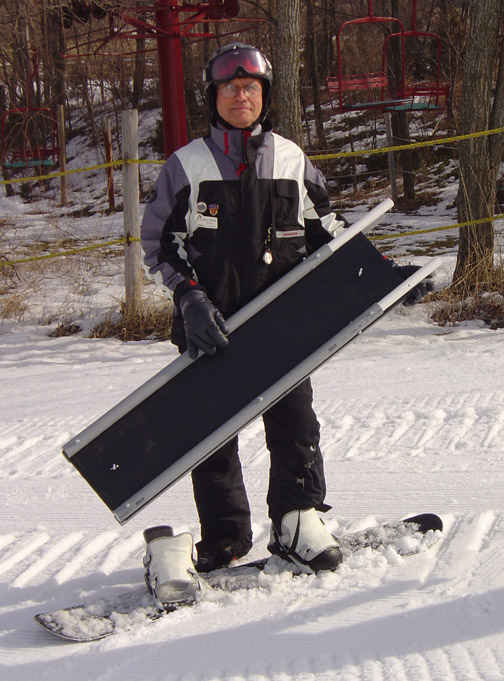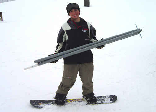 A portable fun box weighs in at around 29 pounds (photo 1), and the portable rail feature (photo 2) typically weighs 12 pounds and are both approximately 8 feet long when assembled. The fun boxes and rails we use at Wilmot Mountain use PVC pipe in their construction (the fun box uses it for support under a flat upper surface made of a sheet of expanded PVC flat stock) and they are easily disassembled for rapid transport. Once placed on the snow, the portable features are held in place by snow anchors, small bolts extending below the portable feature that grip the snow surface and prevent movement of the device while riders are on top (see sidebar).