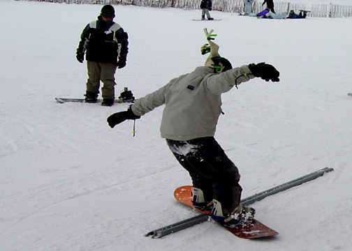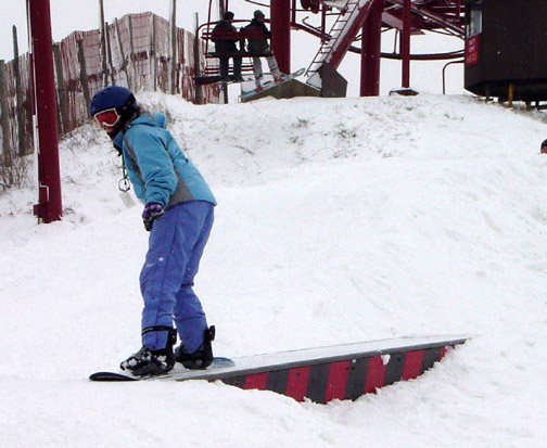 A student’s first shot at riding a feature can result in a variety of outcomes. While some students might totally miss the feature on a first approach (photo 4), there’s nothing wrong with that outcome because they’re still getting practice in lining up parallel to the feature. In fact, students with a reasonably effective stance (i.e., hips aligned with the feet, and using slight ankle, knee, and hip flexion) can benefit a great deal from a trial parallel pass alongside the feature.