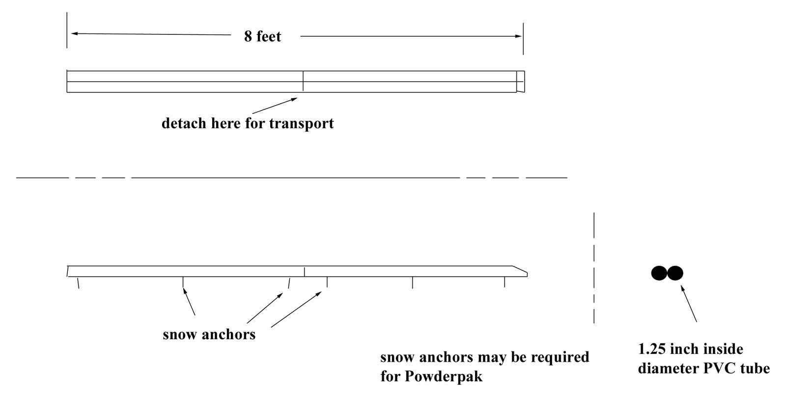 A 1.25 inch outside diameter tube is used to join the two pieces together. Snow anchors are not necessary on artificial snow surfaces such as Powderpak. Figure 2 shows an underside view of the portable feature. The snow anchors are the ¼ inch bolts.