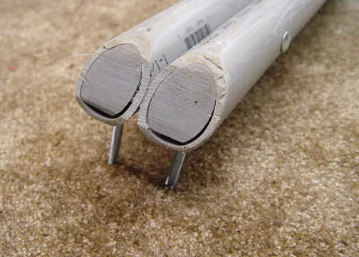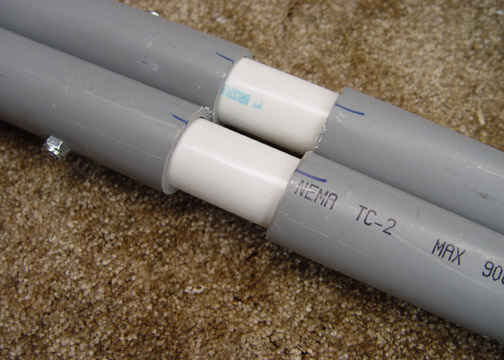 Figure 3 is a drawing of the portable rail which is similar in design. Two 1.25 inch inside diameter PVC pipes are bolted together with a joiner between. Figure 4 shows the joiners which are two smaller tubes to fit inside. Figure 5 shows snow anchors at the ends and a reinforced entry area with solid PVC rod to stand up to wear. Like all other terrain park features, the upper surfaces tend to wear and should be replaced periodically. From our experience, the features do not seem to damage skis or snowboards.