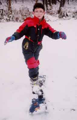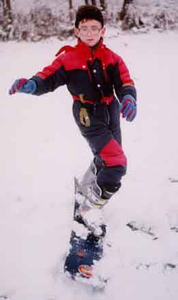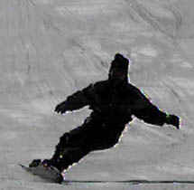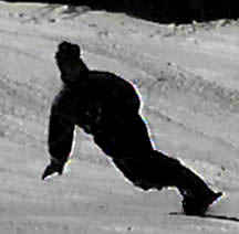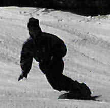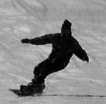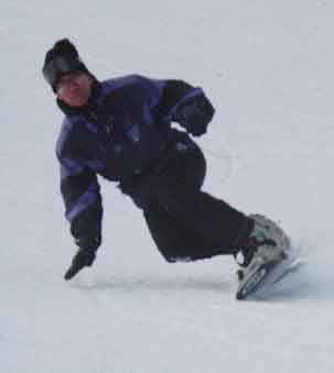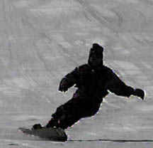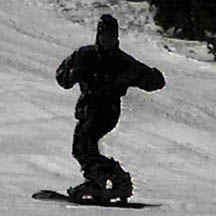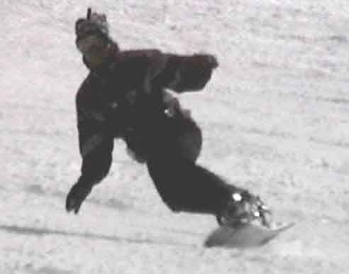 The rider above performs a deep toe side turn. With hard boots he brings his knees together causing the board to bend under foot. With a slight movement of the body toward the tail of the board, one can see the front of the board leave the snow with the weight on the rear 50% of the board. This causes a sharper turn and more