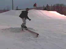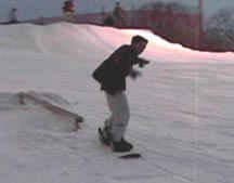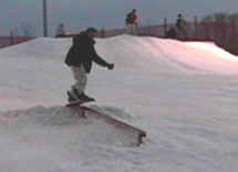 photos is a low grind rail which is about 6 inches off the snow, a good one for the first ride. Approach the rail straight on