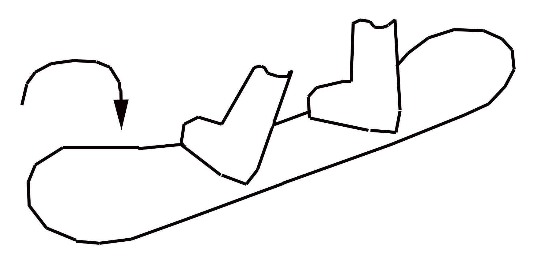 In Photo 4, the rider is crossing the fall line (the line of steepest descent) with inclination or tilting of the body in the direction of the turn. The rider controls the shape of the turn by the amount of inclination and amount of rotation of the body. Photo 5 shows the completion phase of the turn. Notice that the body rotates as a unit with the board, their relative positions being nearly the same throughout the turn. Figure 6 shows the completed turn which ended with a heel-side traverse.