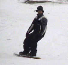 Photo 1 shows the basic toe-side traverse stance using soft boots in a freestyle position. The boots are facing nearly perpendicular to the direction of travel with a shoulder leading, in this case the left shoulder. Initiate the turn by moving the center of mass or body weight in the direction of the turn as shown in Photo 2. Continue to lean in the direction of the turn so that the old free edge of the board engages in the snow. Rotate your whole body as a unit in the direction of the turn as shown in Photo 3.
