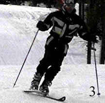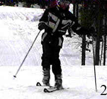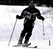 Skiing on one ski is a fun trick and a great edging exercise. In Photo 1 the skier has lifted the right foot off the snow so that all weight is on the left foot. To turn right, lean right but keep angulated to maintain balance (Photo 2). To turn left lean left but maintain balance through angulation (Photo 3).