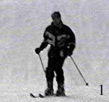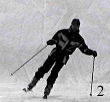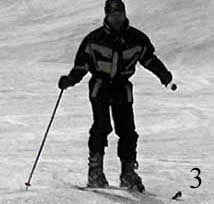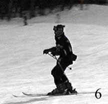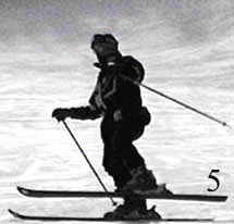 Place all the weight on the new inside ski and raise the outside ski as shown in Photo 4. Christie on the inside ski as shown in Photo 5. Return to the straight glide position (Photo 6) for the next turn.