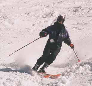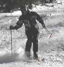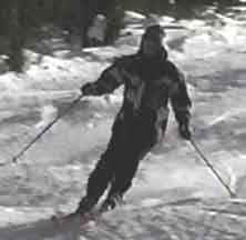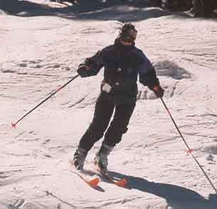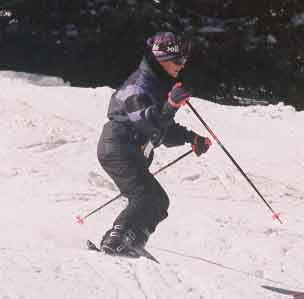 The two photos above show the skier making quick edge changes, a must in bump skiing to prevent excessive speed and to form a serpentine path through the bumps. Picking the proper path through the bumps is a skill that will develop over time. Try to be looking at least one bump ahead so that the turning is smooth and continuous.