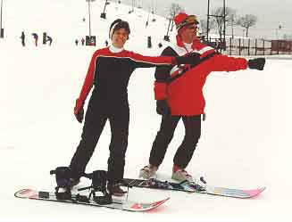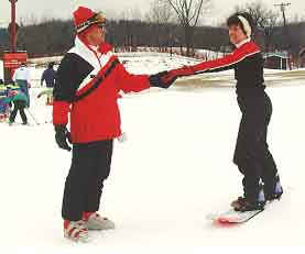 Initially, learning how to turn using a snowboard is often challenging. Shown above is an easy way for the instructor to guide the student through a turn. The instructor holds the leading hand of the student