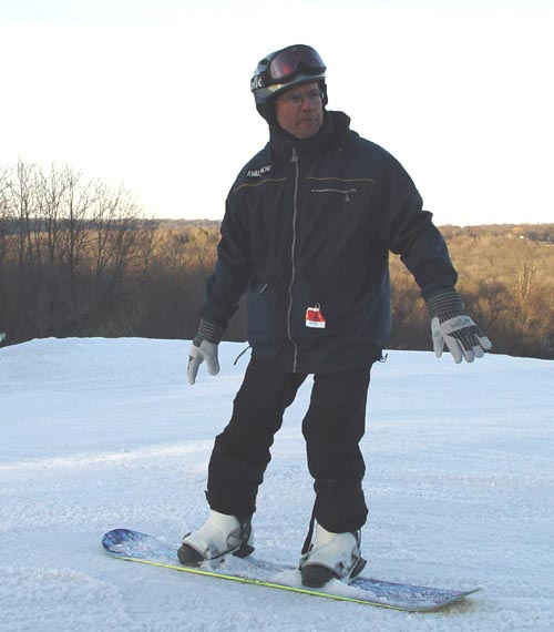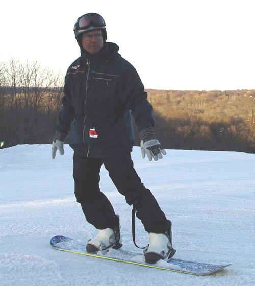 There are hundreds of ways to stand on a snowboard since there are hundreds of orientations of the bindings on the board. Typically the weight is over the center or slightly forward of the center of the board. The hands can be facing in the direction of travel and held in a relaxed position or can be placed along side the legs as shown in Photo 1 above. The above rider is in the regular foot stance, left foot forward. Shown below in Photo 2 is a static exercise where the student rocks backward and forward (Photo 3) to get a feeling of proper positioning on the board. The head is always looking in the direction of travel.