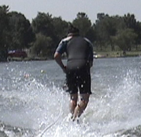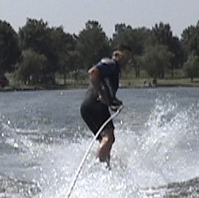 Pull into the reverse wrap position (Photo 4) and hold the rope close to the body to prevent unwinding. This completes the back to back 360. The reverse is accomplished by moving the rope handle away from the center of the body allowing the skier to rotate back as shown in Photo 5. Continue the reverse rotation (Photo 6) into the original wrap position (Photo 7) to complete the reverse.