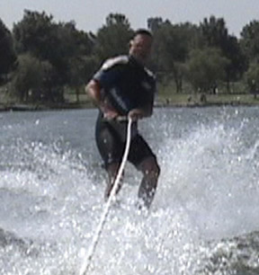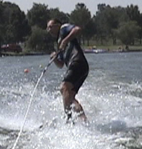 Start in the wrapped position as in Photo 1. Move the hands away from the body which allows the rope to rotate the skier starting the 360 (Photo 2 ). Continue the rotation thorough the reverse side slide position with a slight pull from the rope (Photo 3).