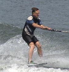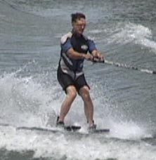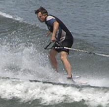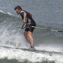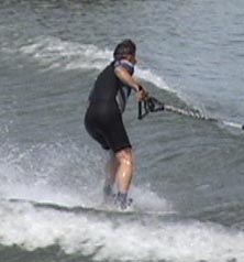 the skiing position (Photo 1)rotate away from the boat through the side slide position to the back position