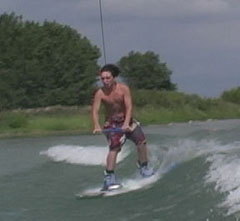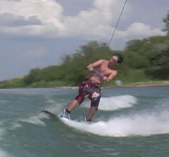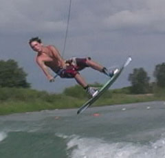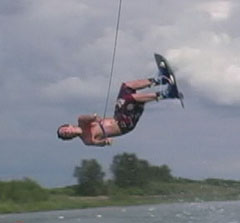 The heelside backroll is a beginning flip and should not be tried without special training and adherence to safety principles. Hit the wake and simultaneously drop the handle for slack during landing. Lean the body back as you lanch from the wave and carve away from the boat. This will start the body rotating, as shown in photo 2. Suck in the legs to increase rate of rotation. The body should be inverted at least by the high point in the jump (photos 3 and 4). Spot the landing (photo 5) and quickly extend and absorb (photo 6).