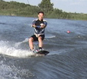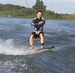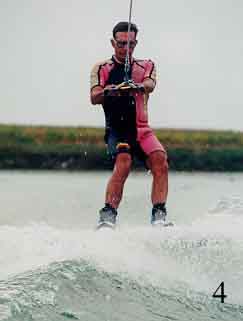 A fun trick to perform on the wakeboard is the wake side slide. First ride the board onto the top of the wake (Photo 1). Then quickly pivot the board into an open stance facing the boat (Photo 2). The reason why this trick is done on top of the wake is to break loose the two fins on the twin tip so you can slide sideways. Adjust the side slide to stay over the wake (Photo 3). Keep the leading edge of the board slightly up to avoid tripping. To return to the forward position, simply shift your weight to the back of the board, the heel fin will engage and swing you around into the forward position.