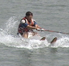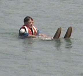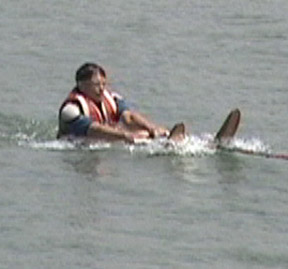 sitting in the water with a flotation device and the skis in from with the tow line between the skis (Photo 1).