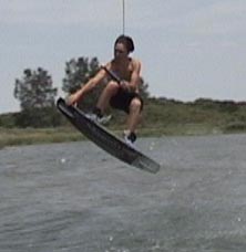 Cut to the wake and get some air (Photos 1 and 2). Wrap the front arm around the front leg and grab the toe edge just ahead of the front foot