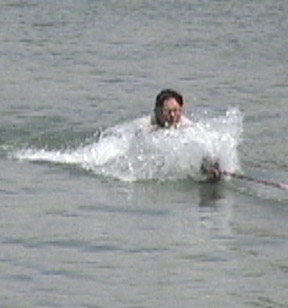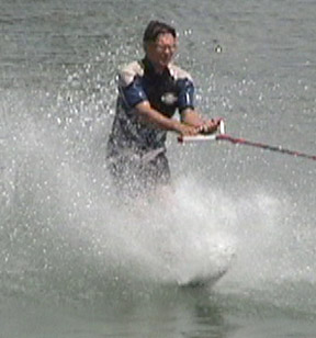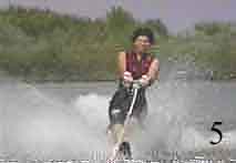 As the ski begins to plane, slowly stand up as shown in Photo 4. As speed increases, lean back to resist the tow rope pull and assume the skiing position (Photo 5).
