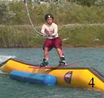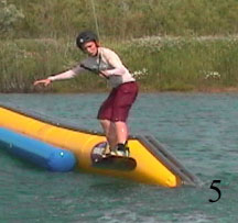 Land on the rails and ride in "butter slide" position with the open (toe) side lip of the board leading the way (Photos 3 and 4). Ollie off the end (Photo 5) and land it with absorption either regular or switch (Photo 6).