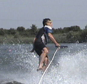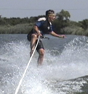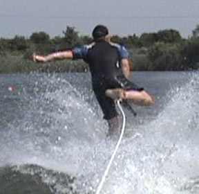 To perform the single ski stepover (worth 160 points in competition), kick the rear foot free of the binding and place it alongside the ski foot (Photo 1). Begin the turn by rotating the body and raising the knee (Photo 2). Raise the knee over the rope and continue to pivot into the 180 degree position (Photo 3).