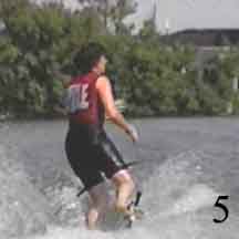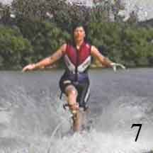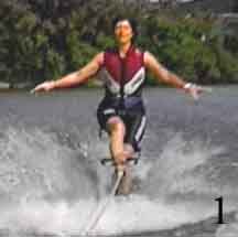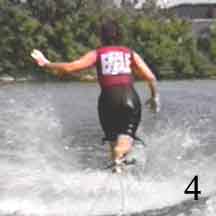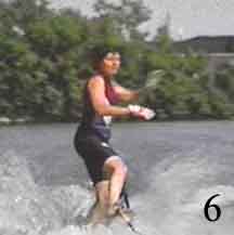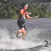 absorption of waves and wake (Photo 1). Pull in rope leg slightly and rotate upper body counter clockwise looking down when using the right leg as the rope leg (Photo 2). Stop the rotation at 180 degrees from the